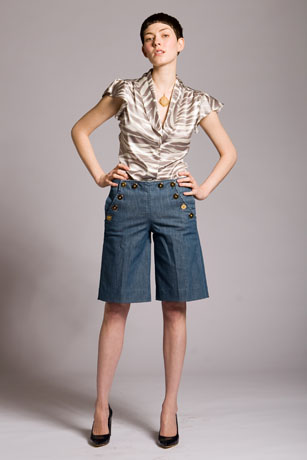 Denim sailor cut shorts w/ front sailor flap, 18k gold buttons and side pockets. Perfect for sailing away, or a warm summer's day!