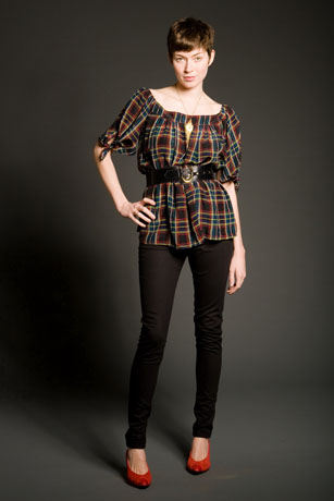 Babydoll top with front and back yokes with gathering and slit sleeve that ties in a bow at the bottom. Black solid